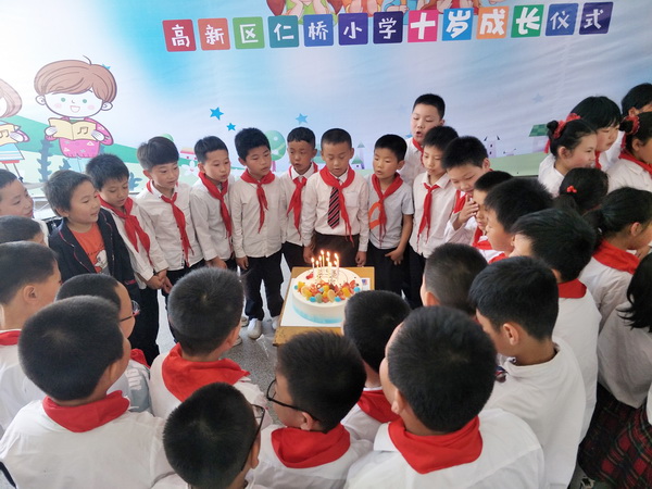 2020年6月6日,仁桥小学举行三年级“十岁成长仪式”,56名小童星及其家长,12名学校领导及教师代表欢聚一堂,以歌舞、小品、器乐等形式共同欢庆十风生日,共同见证幸福时刻,共同讴歌美好生活,为成长加油,为明天喝彩,感恩父母的养育之恩和老师的培育之情,精美的蛋糕将活动推向高潮。