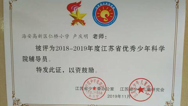 卢庆明老师被评为江苏省优秀少年科学院辅导员
