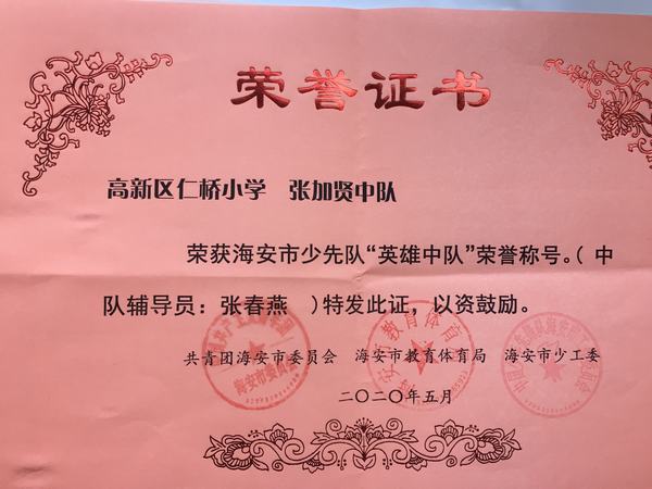 仁桥小学五(2)中队荣获海安市“英雄中队”称号