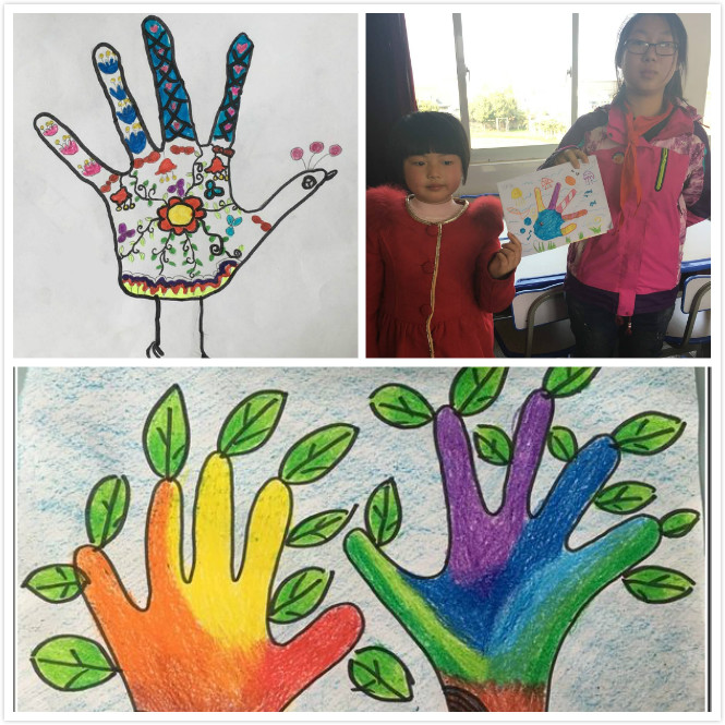 4月16日万里晴空,阳光灿烂,仁桥小学美术社团的42个孩子和陈老师正在用手掌一起创作呢!孩子们小组合作,大手牵小手在一张张白纸上摆弄自己的手形,想象这种手形能添画成什么东西,然后将手按在纸上,用笔将手形沿着轮廓画下来,再用神奇的小画笔进行添画和涂色。