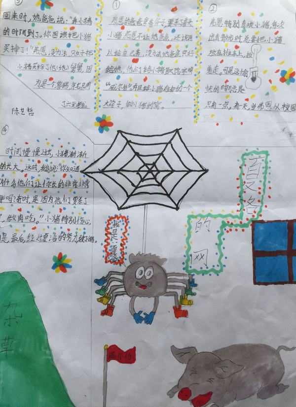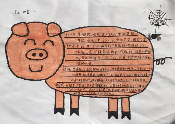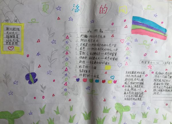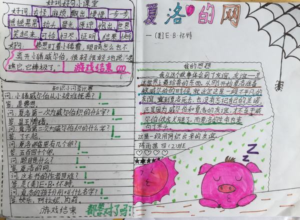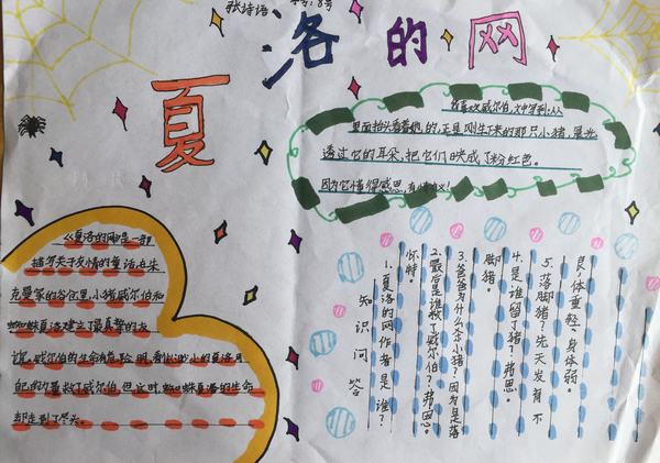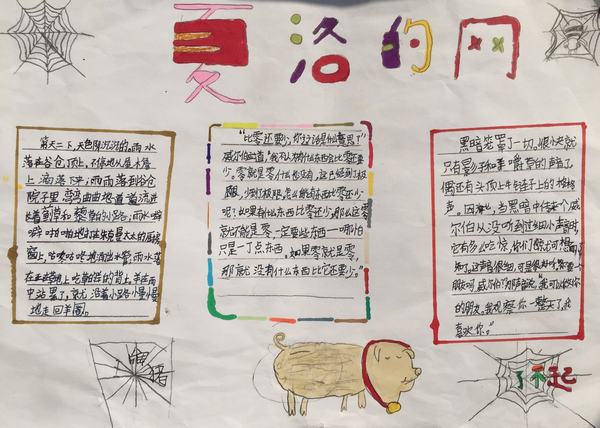 孩子们不仅在老师的指导下读好书,还制作了精美的手抄报在小组内进行阅读感悟的交流。阅读打开了他们的心灵之窗,抒发他们对生活的热爱,在他们幼小的心灵里播下爱的种子,陶冶高尚的情操。虽然《夏洛的网》读完了,但孩子们的读书生活还未结束,他们将带着一份沉甸甸的收获走入新的阅读之旅中去。