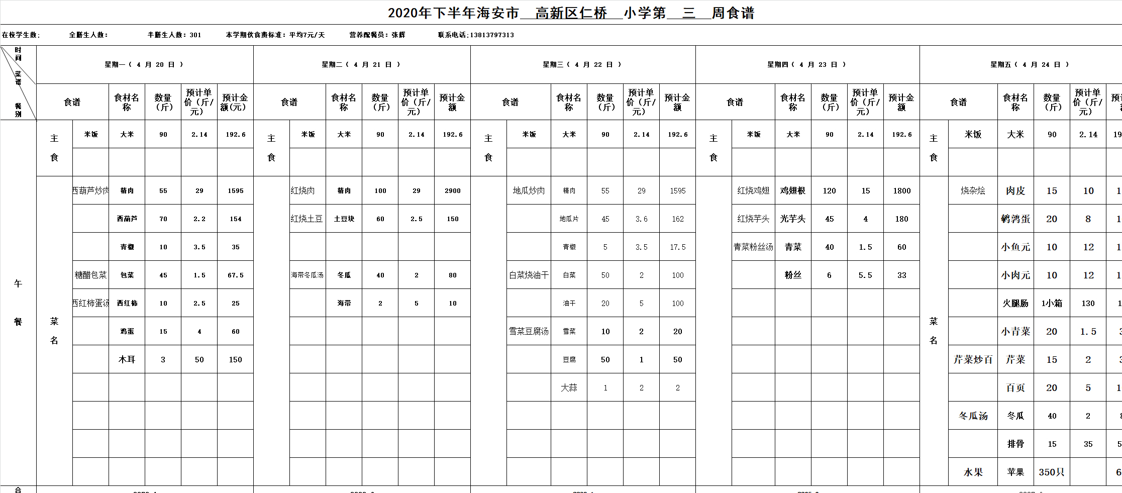 仁桥小学第3周学生营养菜谱