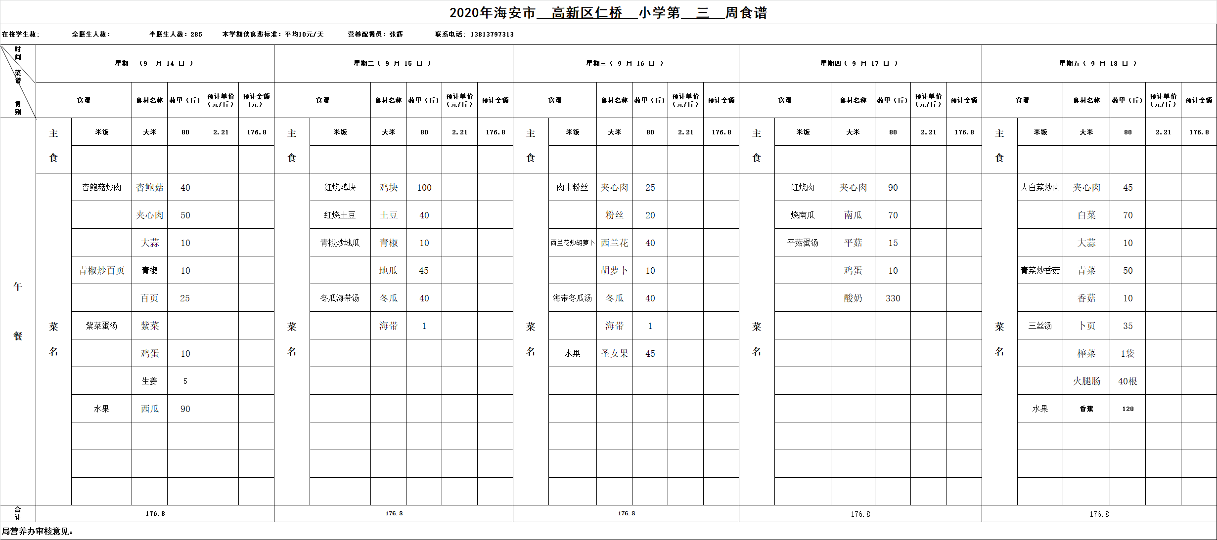 高新区仁桥小学第3周营养食谱