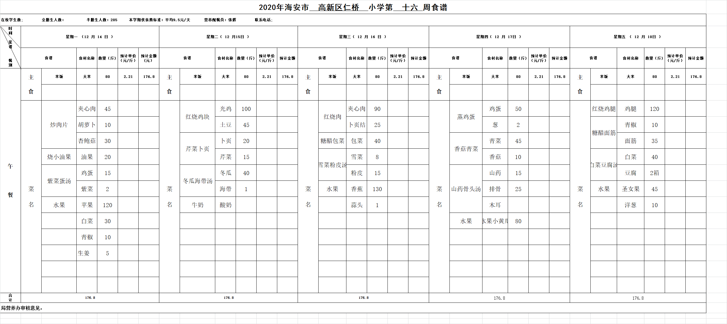 高新区仁桥小学第16周营养食谱