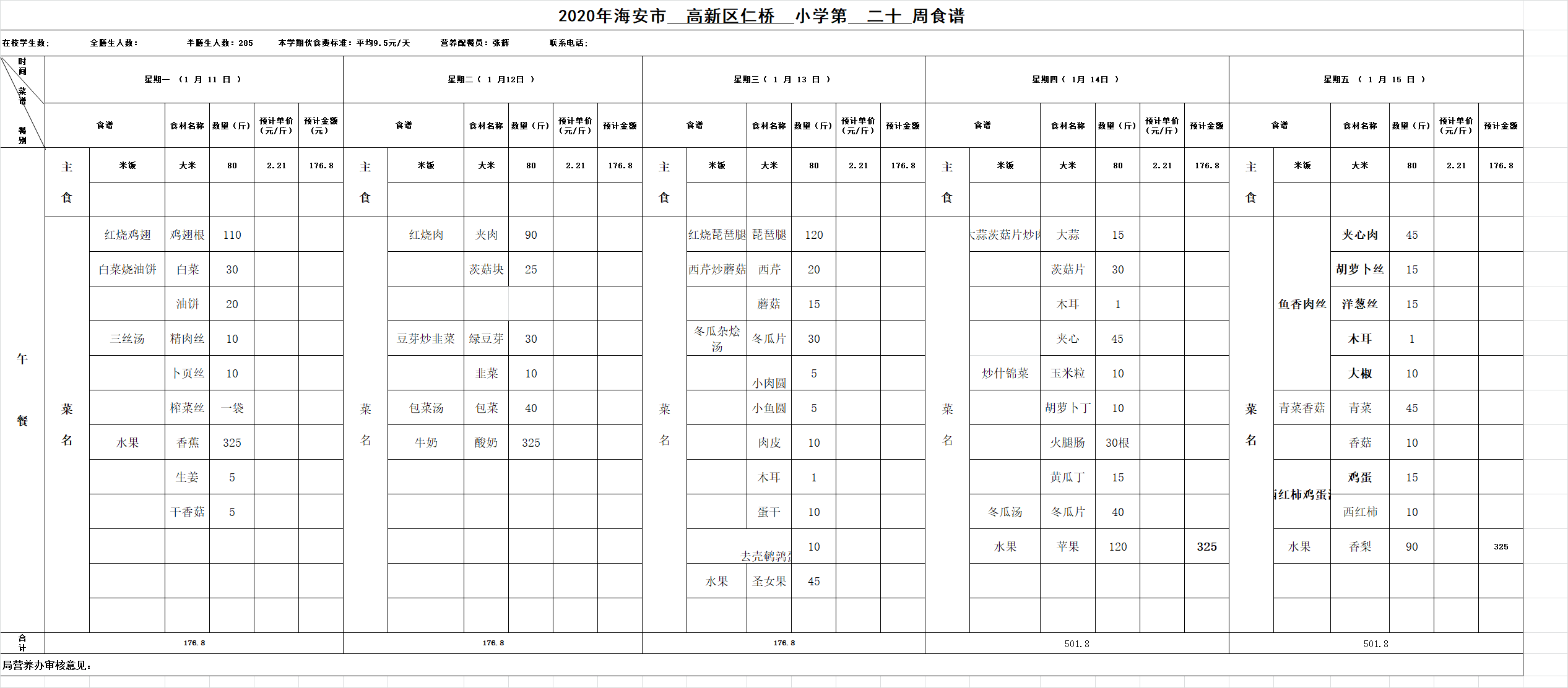 高新区仁桥小学第20周营养食谱