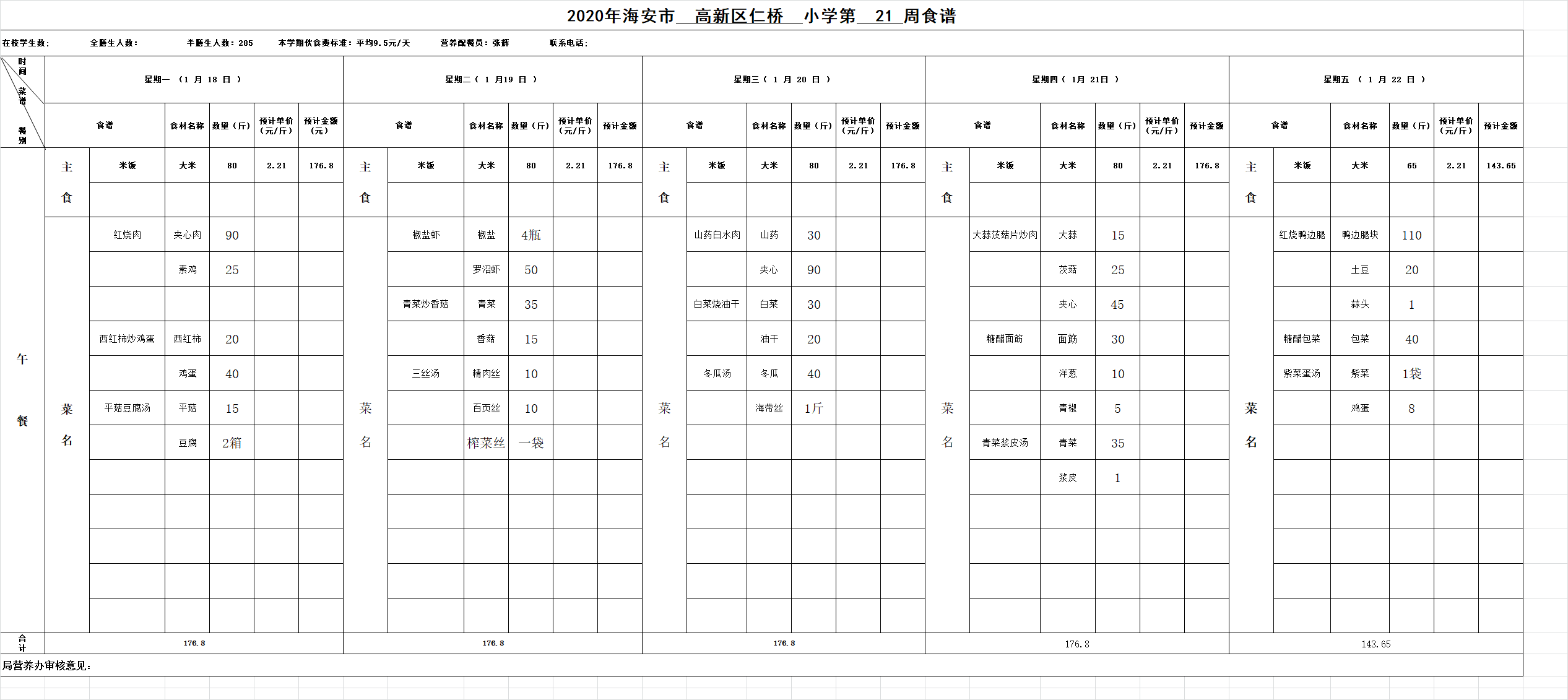 高新区仁桥小学第21周营养食谱