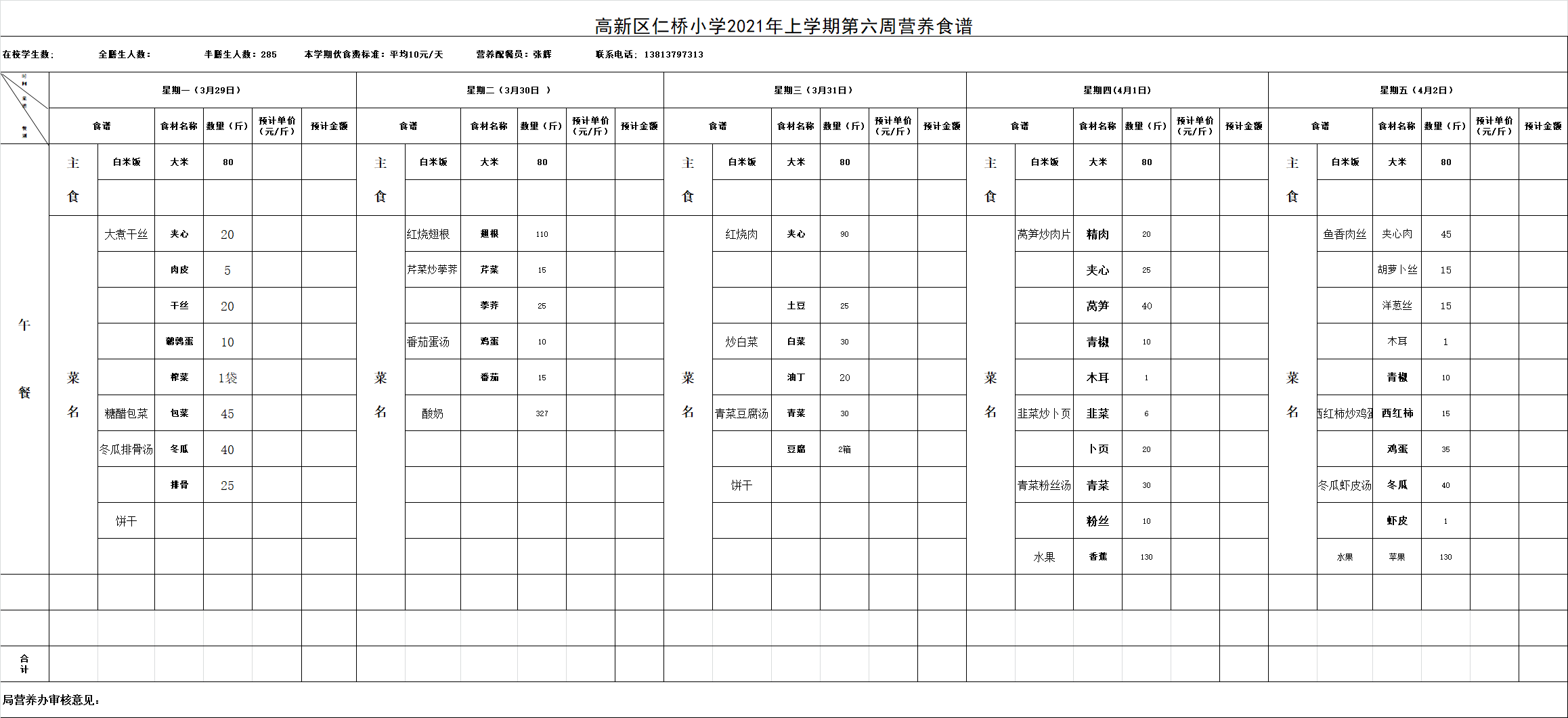 高新区仁桥小学第6周营养食谱
