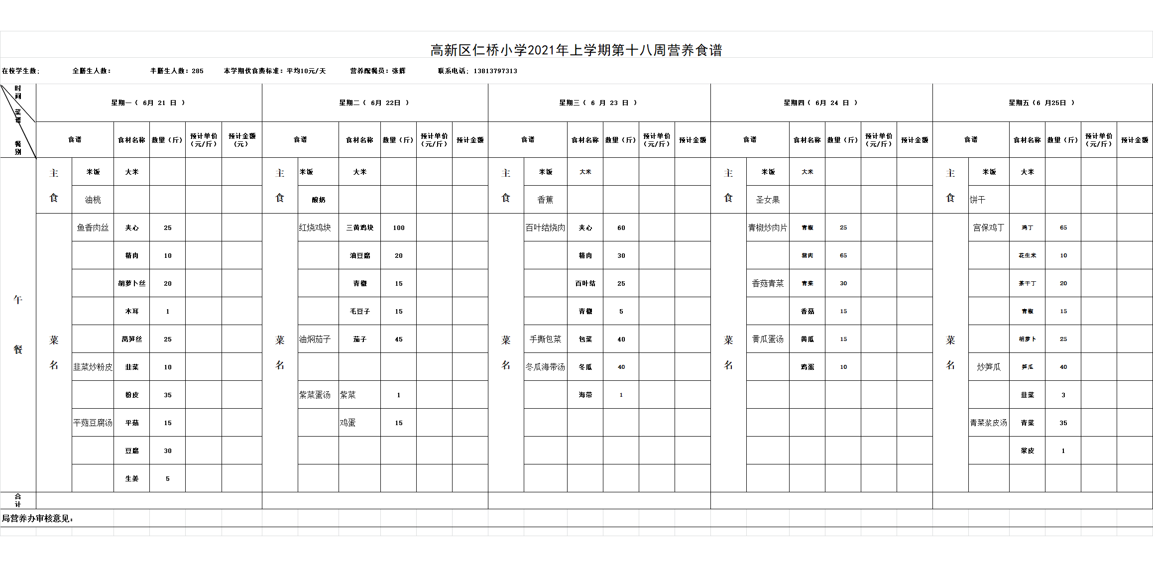 高新区仁桥小学第18周营养食谱