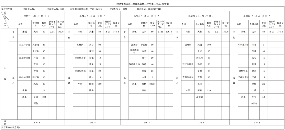 海安高新区仁桥小学第12周营养食谱