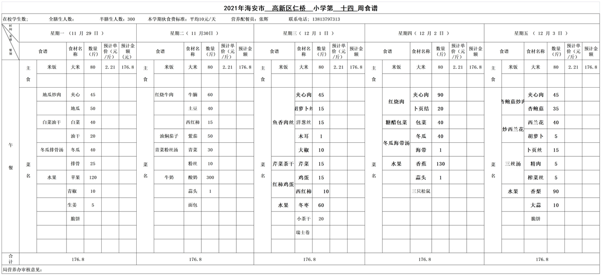 海安高新区仁桥小学第14周营养食谱
