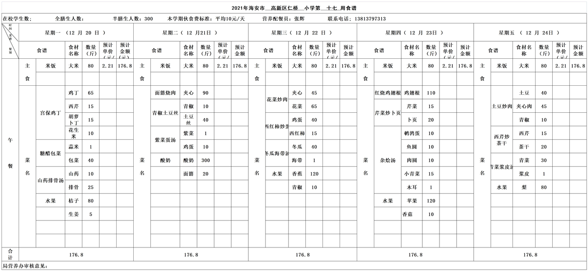 海安高新区仁桥小学第17周营养食谱