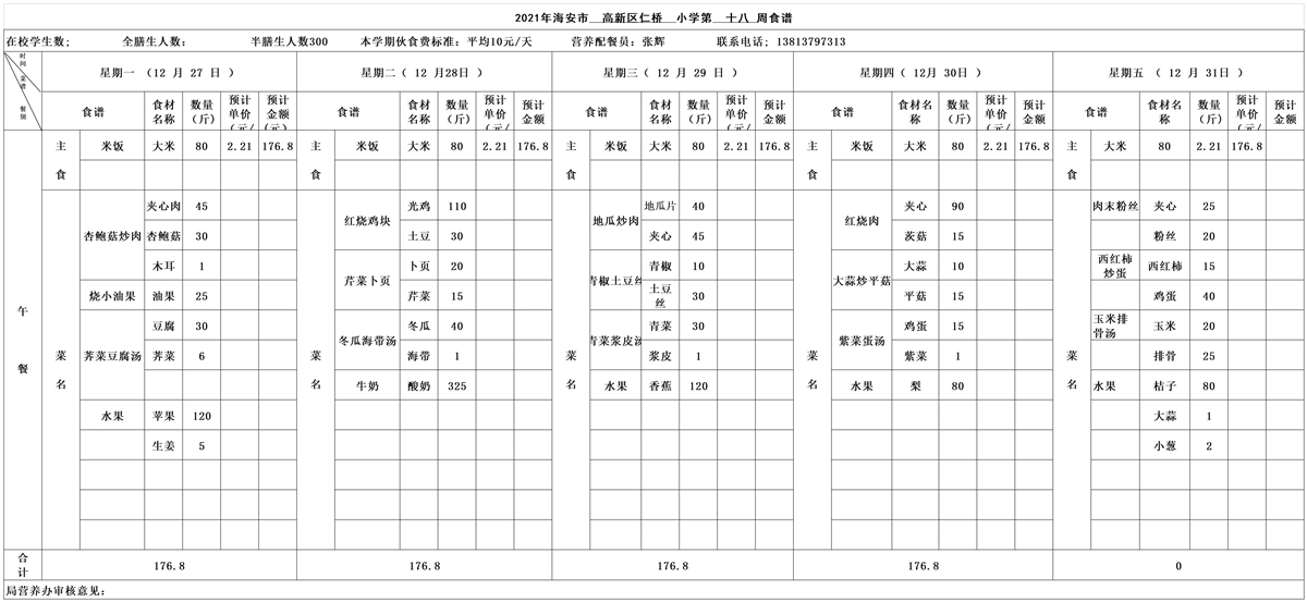 海安高新区仁桥小学第18周营养食谱