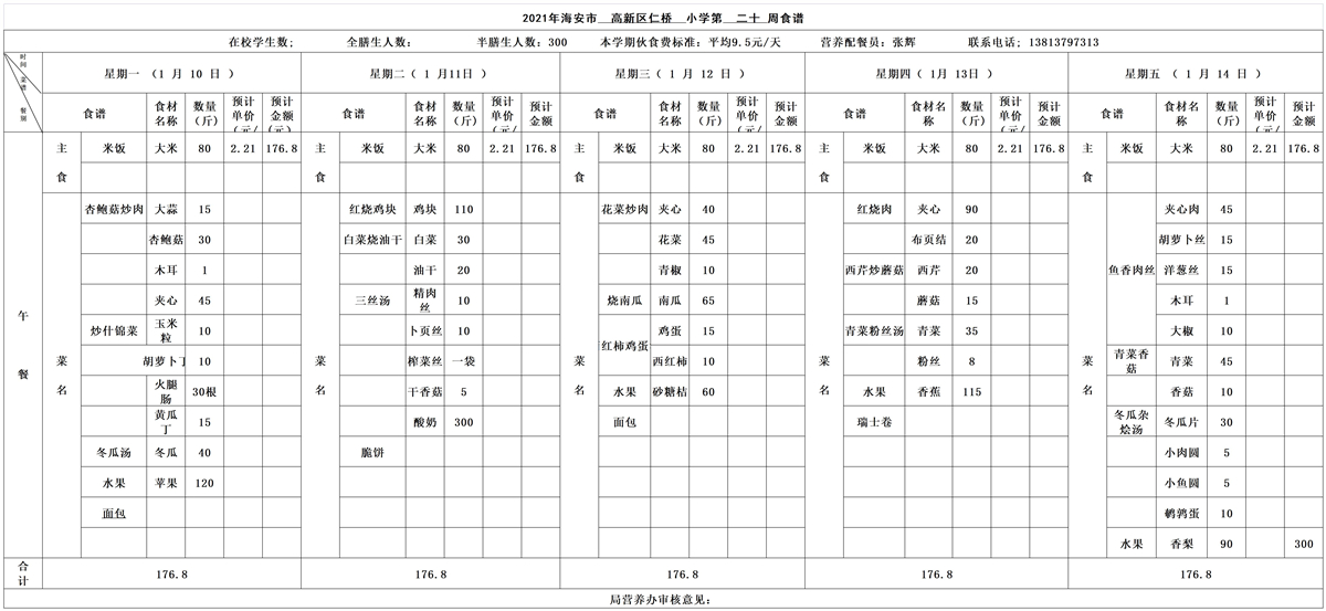 海安高新区仁桥小学第20周营养食谱