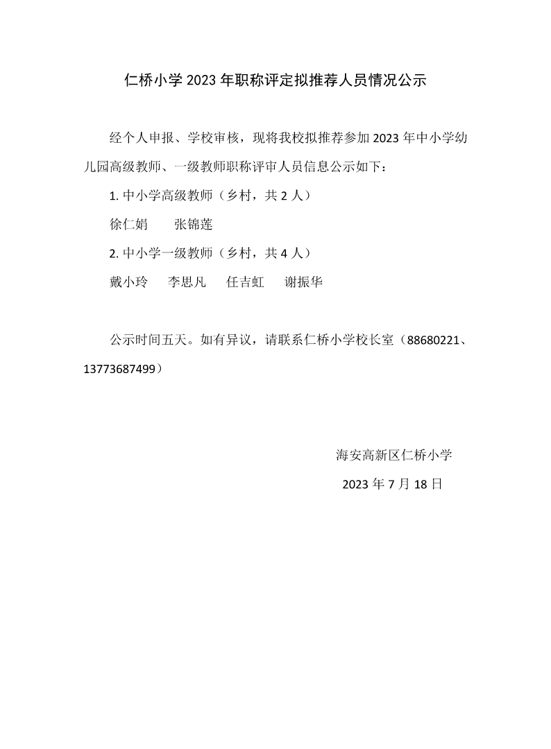 仁桥小学2023年职称评定拟推荐人员情况公示