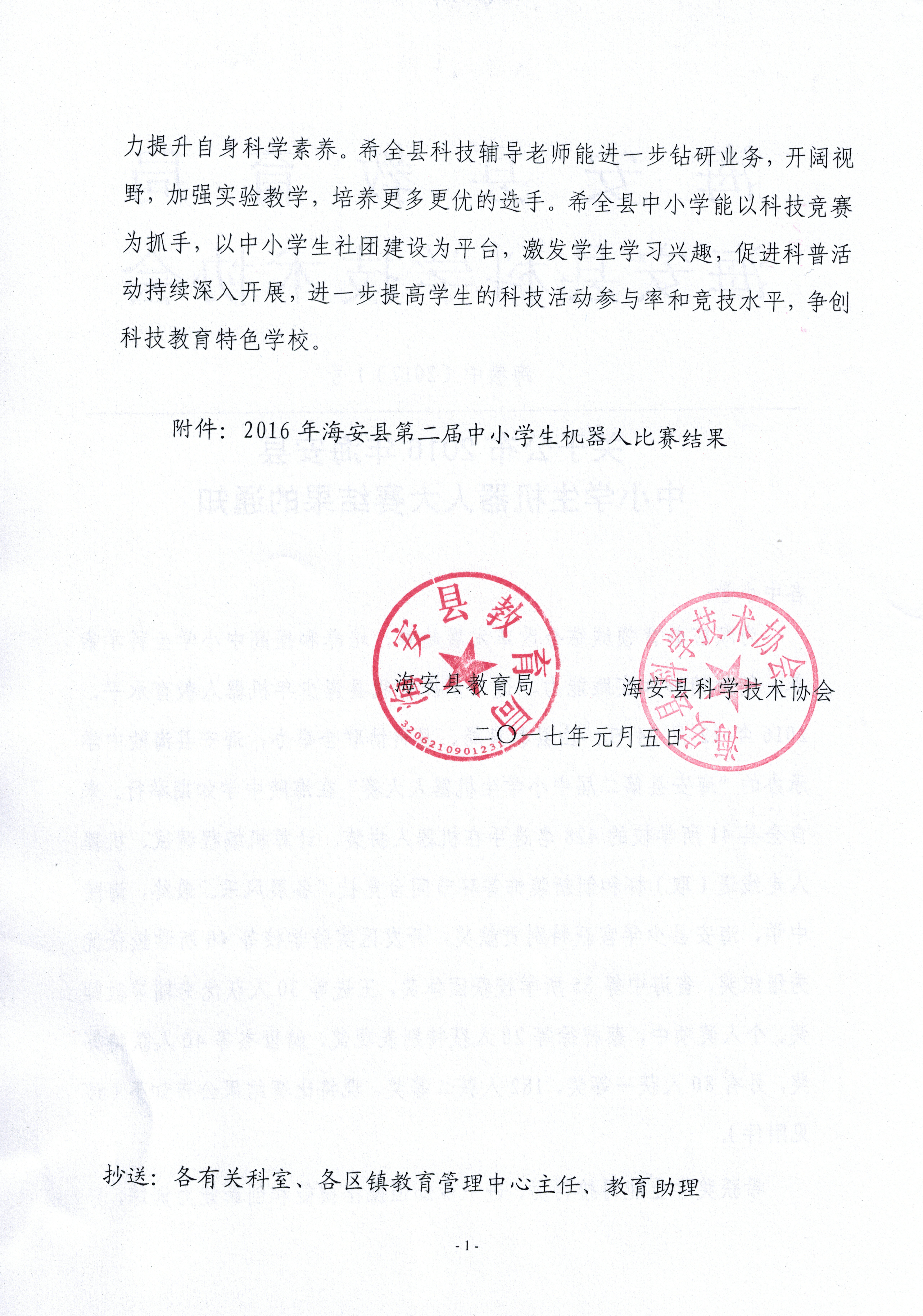 关于公布2016年海安县中小学生机器人竞赛结果的通知