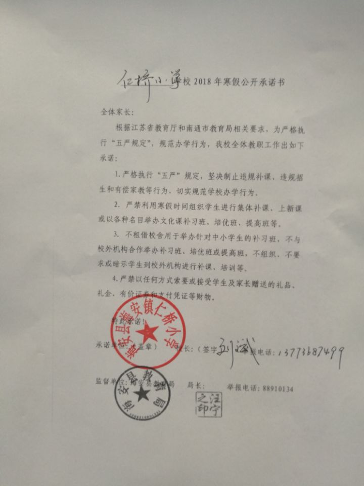 仁桥小学2018年寒假公开承诺书