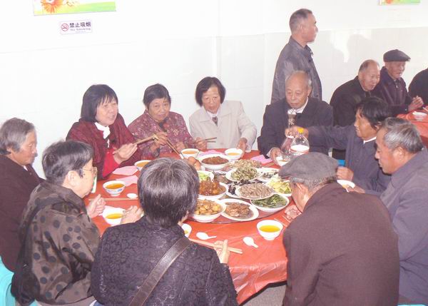 活动后,老同志们在食堂聚餐,大家频举杯同祝愿,祝愿仁桥的教育更进步,祝愿今后的日子更幸福。