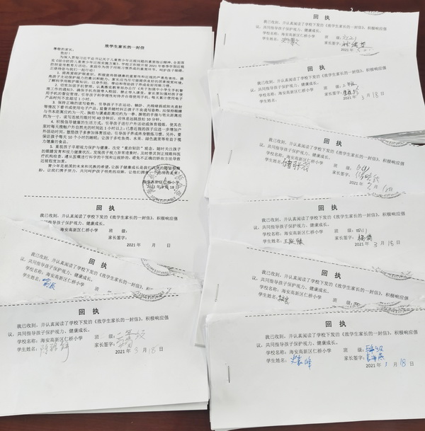 做好近视防控,离不开多渠道综合治理。仁桥小学从细节入手,全方位培养学生良好的用眼护眼习惯,并将学生近视率防控指标列入教师考核内容。同时,学校坚持家校协同,通过致学生家长的一封信、家长微信群等形式,切实强化家长在孩子近视防控工作中的责任意识,督促家长为孩子提供良好的居家视觉环境,控制孩子在家使用电子产品时长,同时做好作业、睡眠、读物、体质等项目的科学管理,引导孩子注重保护视力,促进身心健康发展。