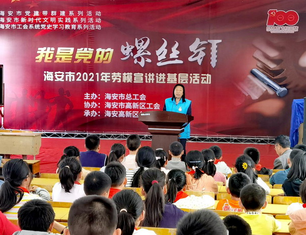 “学习雷锋好榜样,忠于革命,忠于党,爱憎分明不忘本,立场坚定斗志强……” 2021年5月17日下午,伴随着熟悉的歌声,由海安市总工会主办、海安市高新区工会协办的海安市党建带群建系列活动、海安市新时代文明实践系列活动、海安市工会系统党史学习教育系统活动 “我是党的螺丝钉”劳模宣讲进基层活动在海安高新区仁桥小学开展,特邀“中国好人”——刘宏燕给队员们带来了一场生动的讲座。