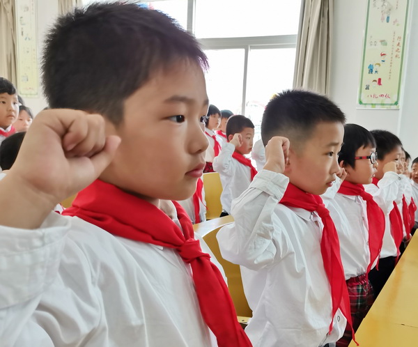 新队员在大队长的带领下庄严地宣誓。振聋发聩的誓词必将鞭策新队员们不懈奋斗,成为德、智、体、美、劳全面发展的新时代少年。