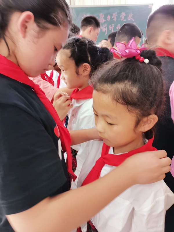 庄严而隆重的入队仪式在雄壮激昂的少先队队歌中拉开了帷幕。会上大队长满怀激情地宣读了新少先队员名单,老队员郑重地为新队员戴上鲜艳的红领巾,告诉新队员红领巾是国旗的一角,代表着荣誉和责任,她将指引新队员健康成长。