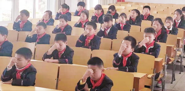 学校注重培养学生良好的用眼卫生习惯,读写时保持正确姿势;要求学生每天上、下午定时、认真做眼保健操,缓解学习过程中的视力疲劳,并将眼保健操列为一日常规的检查,纳入文明班级的评比。